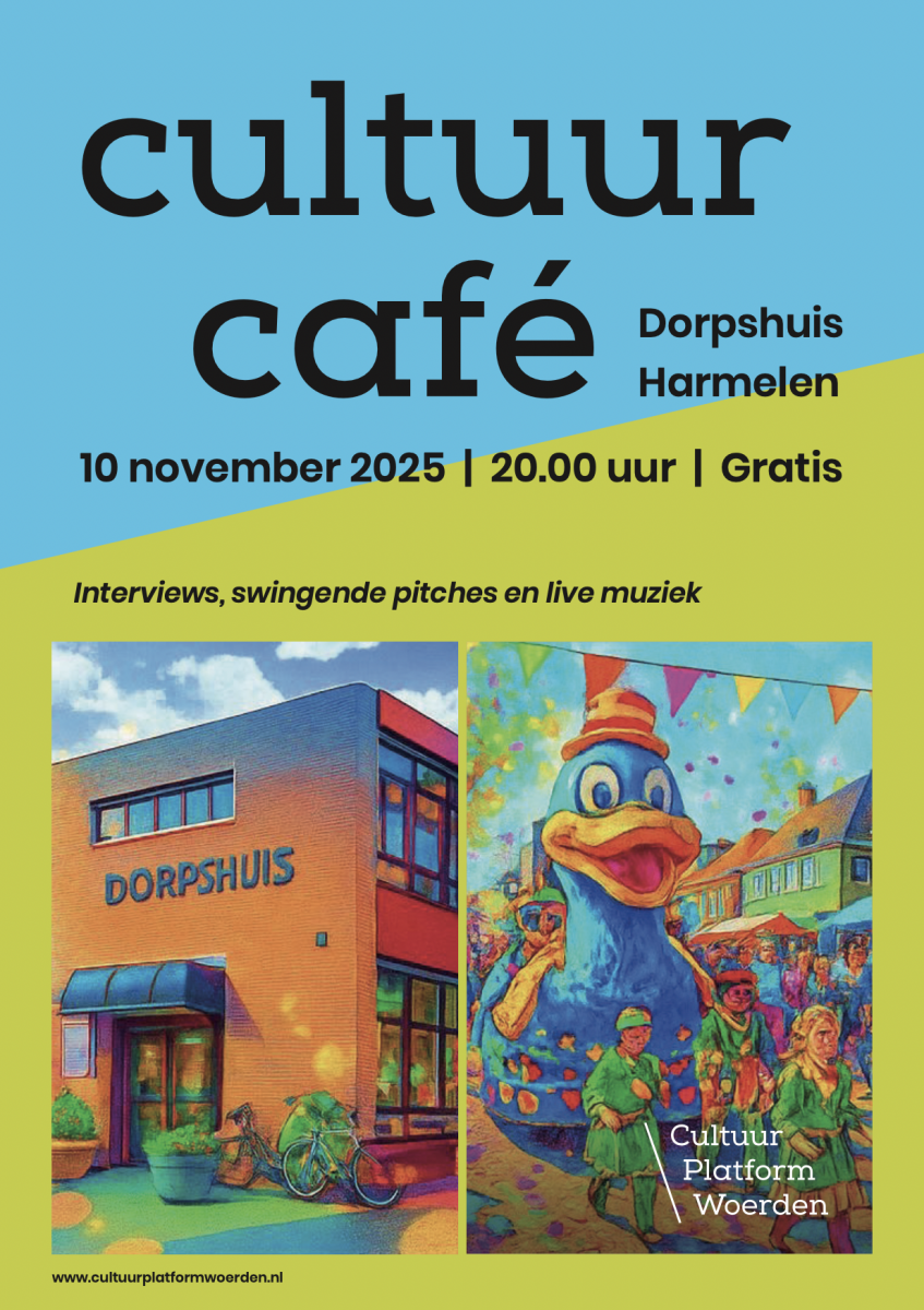 Deze Cultuurcafés vinden plaats op inspirerende plekken door de hele gemeente. Ben je actief in de culturele scene of gewoon dol op creatieve prikkels? Kom dan zeker langs! Schrijf je snel in voor onze nieuwsbrief (onderaan de pagina) en je bent als eerste op de hoogte van de data en gastoptredens. Zelf iets te presenteren? Fantastisch, laat het ons weten!