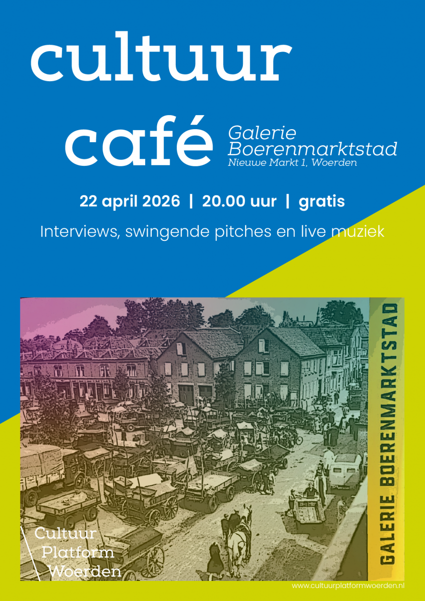 Het Cultuurcafé Woerden komt eraan. We zijn super blij met het aanbod van Agrarisch Centrum Woerden om deze editie te organiseren in de (tijdelijke) Galerie Boerenmarktstad op Nieuwe Markt 1. Verwacht een avond met verrassingen over o.a. erfgoed, boekpresentaties, kunst, boeiende flitspresentaties, muzikale optredens en een proeverij. Presentator Hans Teegelbeckers leidt je door de avond heen. Je bent van harte welkom!
